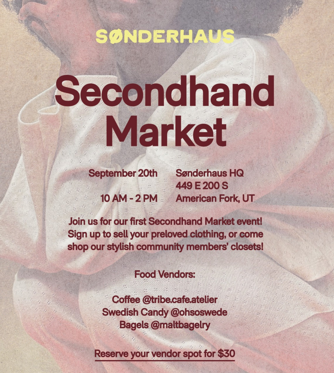 Join us for our first Secondhand Market! In order to promote circular fashion and shopping secondhand, we are hosting an individual seller's market. Sign up for $30 to reserve your booth spot. You'll be required to provide any racks or shelving you might need.